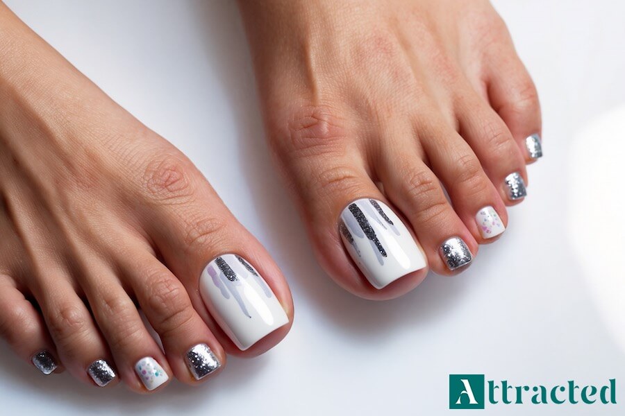 Pedicure przenoszący magię mroźnego krajobrazu na dłonie. Jasne tło imituje świeży śnieg, a ręcznie malowane śnieżynki i srebrne drobiny tworzą wrażenie ruchu – jak płatki wirujące w powietrzu.