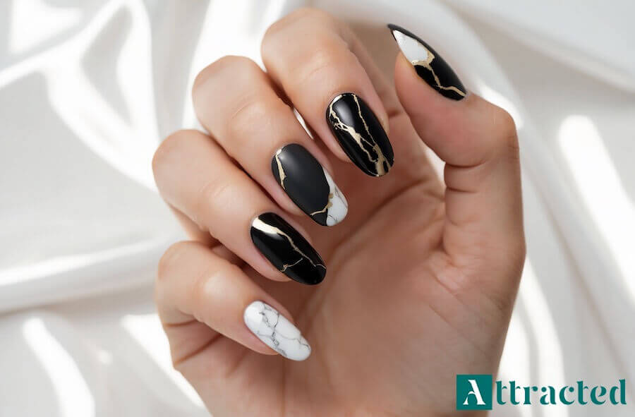 Ten design czerpie z energii abstrakcyjnego ekspresjonizmu, zamieniając paznokcie w miniaturowe płótna. Zamiast klasycznych żył marmuru pojawiają się dynamiczne plamy, rozpryski i zygzaki, które imitują spontaniczność malarskich gestów. Dominują kontrastowe kolory: czerwień, błękit lub jaskrawa żółć na czarnym tle.