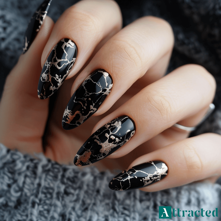 Dopełniające efekty są po to, aby ciemnej płytce dodać przestrzenności. Czarny marmurek w zestawieniu z szarością albo delikatną bielą tworzy wzór przypominający kamień, który na krótszych paznokciach wygląda bardzo elegancko. Można go zrobić pędzelkiem na nieutwardzonej warstwie i delikatnie rozmyć, aby linie nie były zbyt równe.