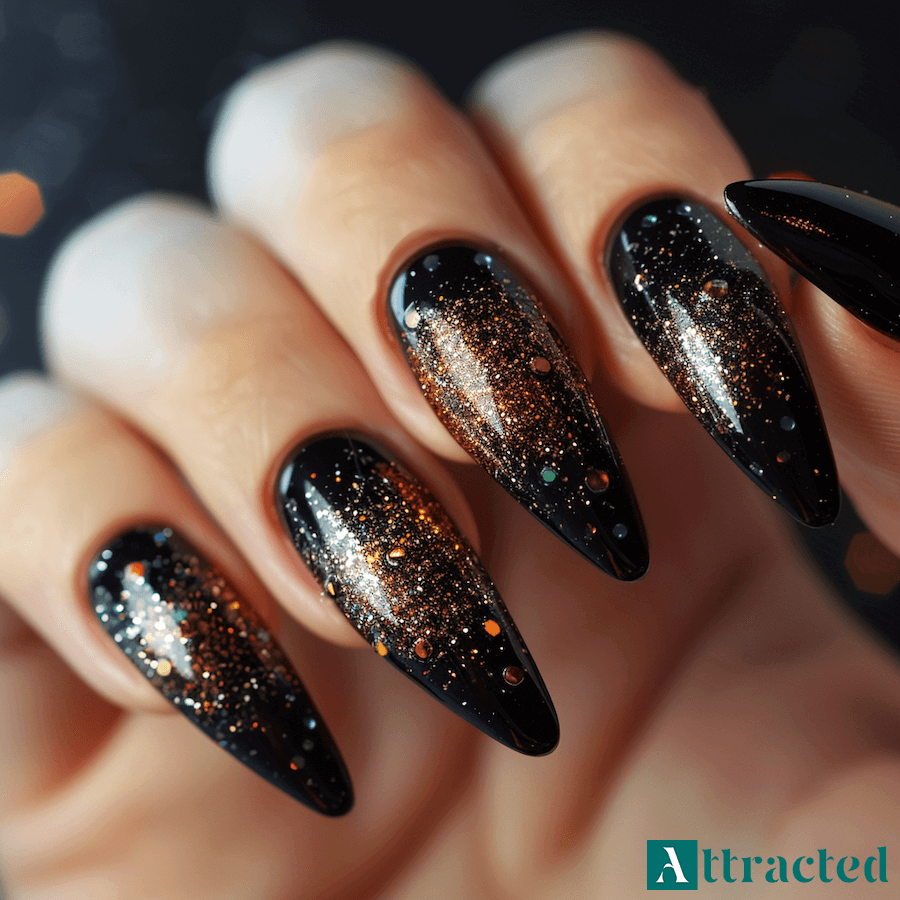 Czarna baza daje bardzo mocny punkt wyjścia, dlatego wystarczy dodać jeden akcent, aby manicure wyglądał bardziej wyrafinowanie. Najprostszy wariant to czarne paznokcie z brokatem na jednym lub dwóch palcach. Brokat może być sypki, w lakierze albo w formie drobnych płatków, które układa się bliżej nasady i rozciąga ku końcówce, tworząc efekt opadającego światła.