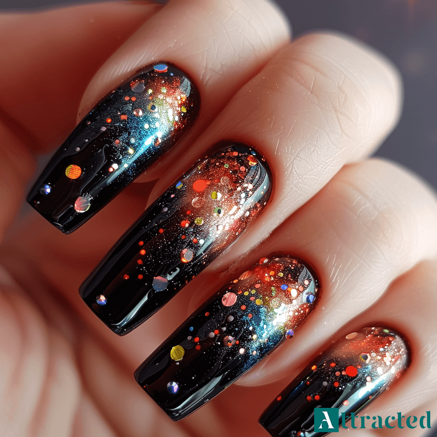 Takie zdobienie sprawdza się przy stylizacjach wieczorowych, gdy pojawiają się czarne garnitury, małe czarne, cekinowe topy albo grube swetry w zimowych miesiącach. Brokat na czerni dobrze wygląda też w połączeniu z czerwienią, butelkową zielenią czy srebrem w ubraniu, bo nawiązuje do błysku dodatków.