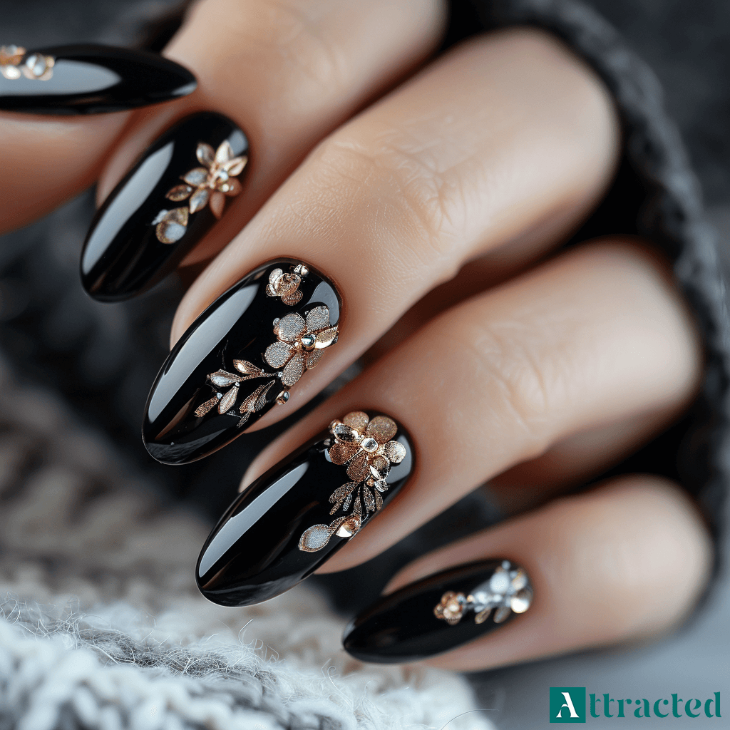 W tej wersji czarny lakier staje się tłem dla dodatków, które dodają powierzchni faktury. Naklejki 3D na czarnej bazie to prosty sposób na uzyskanie wypukłych motywów bez konieczności malowania ich ręcznie. Mogą to być drobne roślinne wzory, motyle, mini ikonki albo złote elementy, które wystarczy przykleić i zabezpieczyć topem.