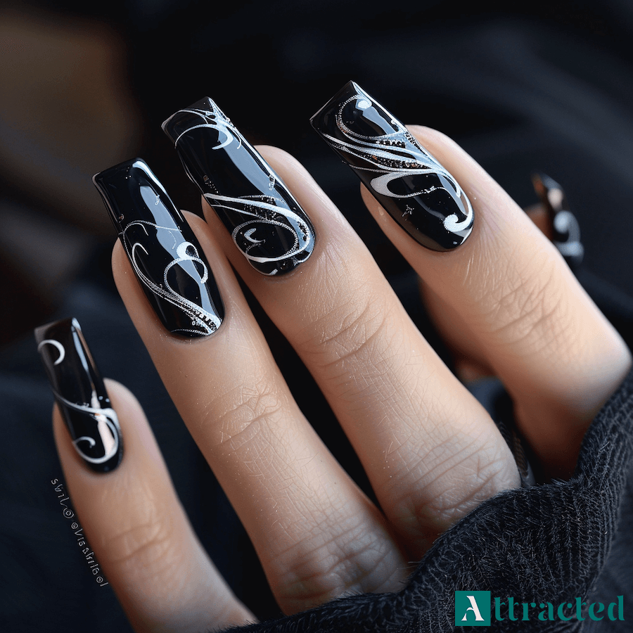 Elegancki czarny manicure z kontrastowymi wzorami
