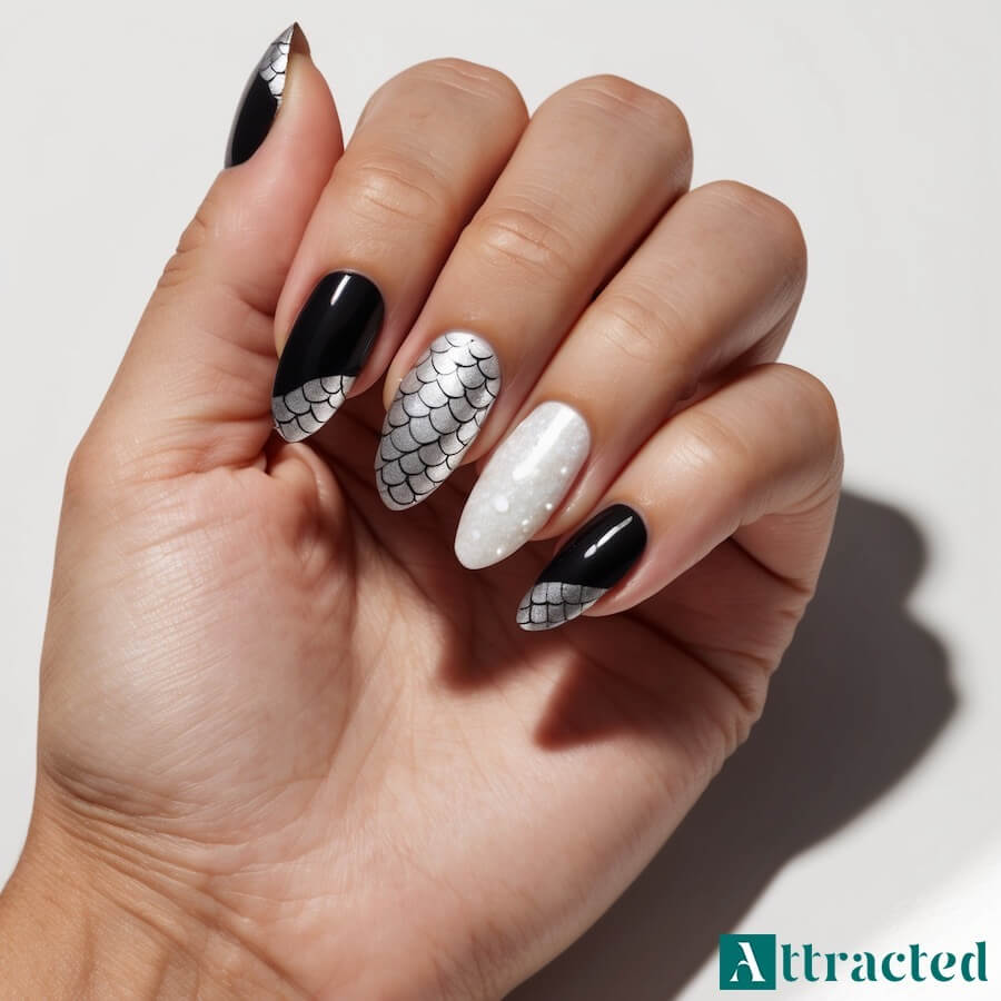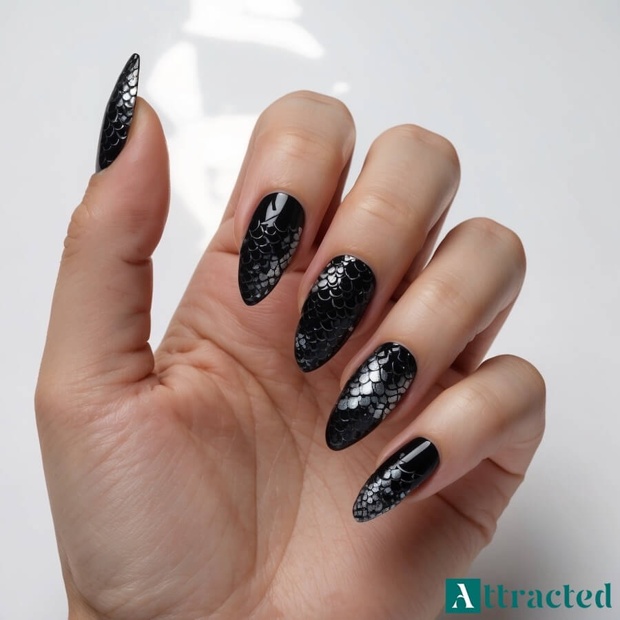 Ten trend łączy buntowniczą energię gotycko-punkowej estetyki z organicznymi motywami syren. Dominuje czarna baza z ostrymi wzorami, takimi jak kolczaste łuski, zygzakowate „szwy” lub geometryczne pęknięcia, które przypominają rozbite lustro wody. Akcenty w odcieniach krwistej czerwieni, głębokiego fioletu lub neonowego różu nadają stylizacji elektryzujący kontrast. Inspiracją są tu morskie głębiny przekształcone w surrealistyczny, mroczny krajobraz.