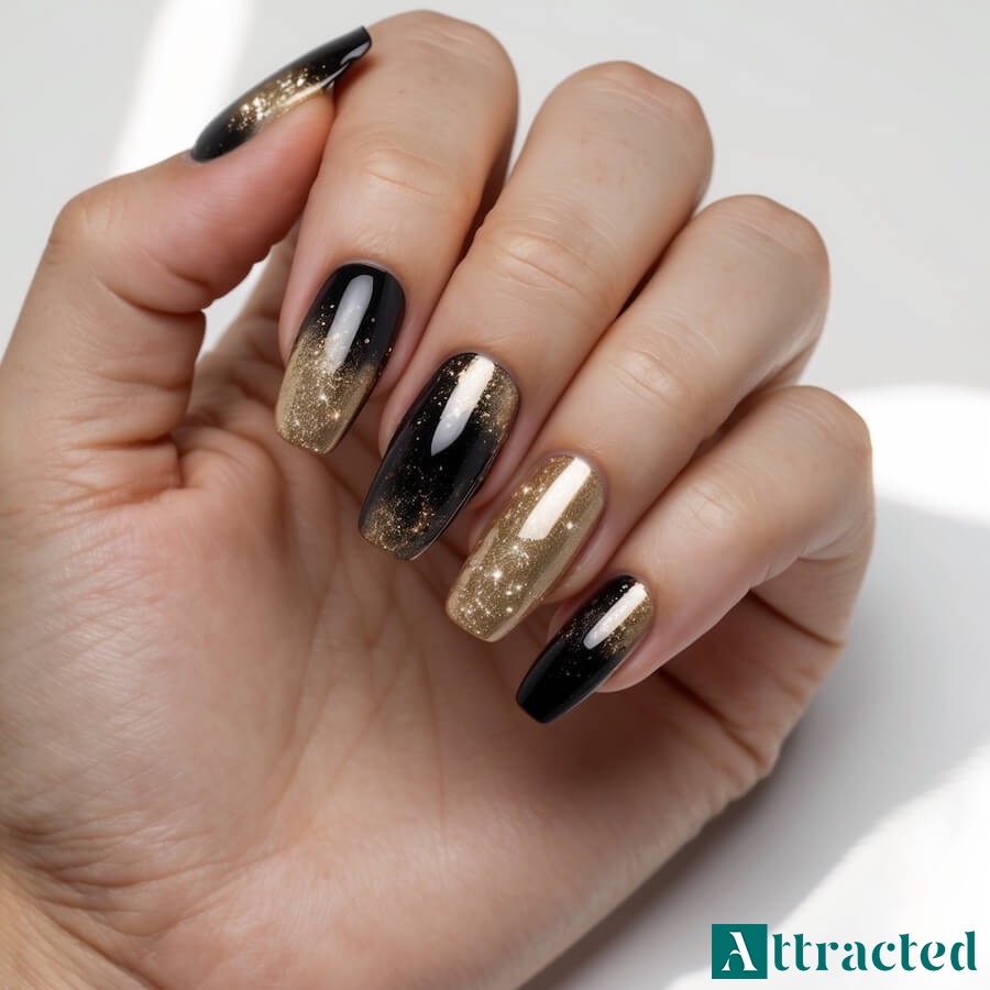5. Czarne paznokcie syrenka ze złotym pyłem