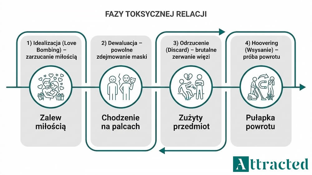 Jeśli zastanawiasz się, czemu wciąż wracasz do osoby, która Cię rani, odpowiedź często kryje się w cyklu toksycznego związku. Najpierw jest idealizacja i bombardowanie miłością, później dewaluacja z gaslightingiem i grą kar oraz nagród, potem brutalne odrzucenie, a na końcu hoovering, czyli dramatyczne powroty z „przypadkowymi” spotkaniami, SMS-ami i obietnicami zmiany. To schemat, który rozregulowuje układ nerwowy jak narkotyk, dlatego rozstanie tak boli. Poznaj konkretne techniki ochronne, czyli zero kontaktu, szarą skałę, wsparcie terapeuty i pracę nad świadomością mechanizmów.