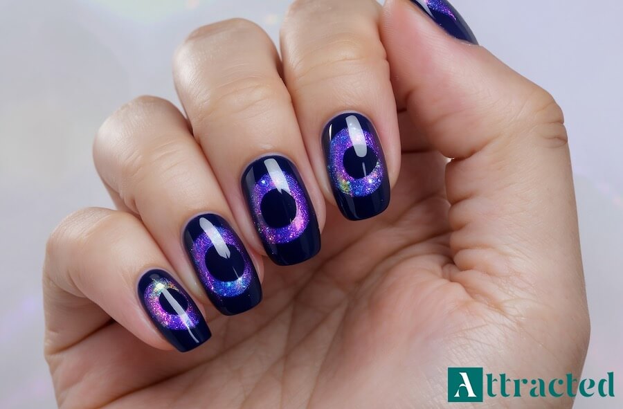 Czym się charakteryzuje? Głęboki granatowy odcień z drobinkami holograficznego brokatu i fioletowymi smugami przypomina fragment Drogi Mlecznej. Efekt 3D uzyskuje się poprzez warstwowe nakładanie lakierów i użycie magnesu do rozproszenia cząstek.