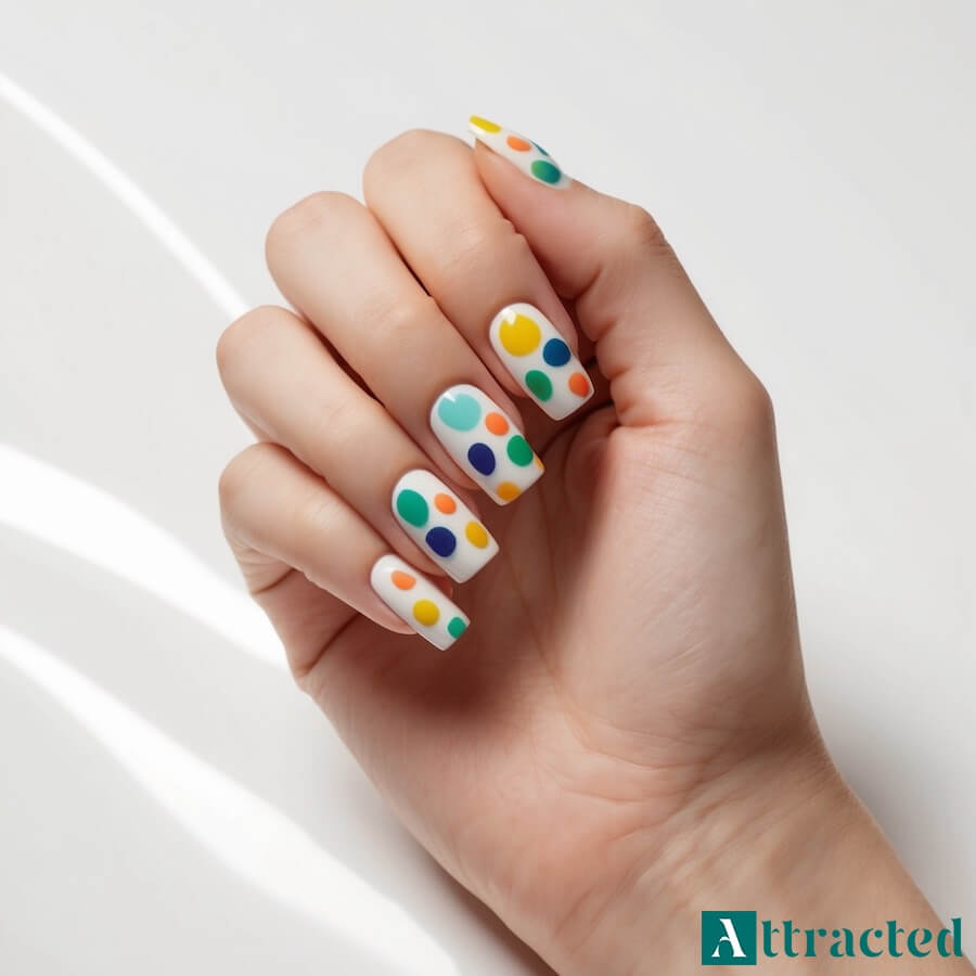 Kolorowe kropki na jasnej bazie to świeża i radosna propozycja na lato. Ten wzór pozwala na kreatywne łączenie kolorów i tworzenie unikalnych kompozycji.