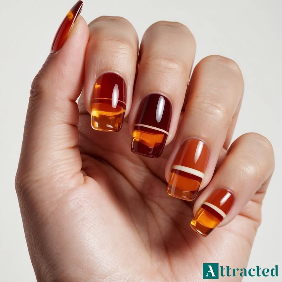 „Jelly” w bursztynowo-miodowych odcieniach to idealny kompromis między kolorem a lekkością. Półtransparentne warstwy budują głębię jak w żywicy: w świetle paznokcie wyglądają jak szkło barwione. Można dorzucić pojedynczy tortoiseshell accent na serdecznym – motyw pozostaje spójny. Sekret tkwi w cienkich warstwach; gdy są zbyt grube, tracą klarowność.