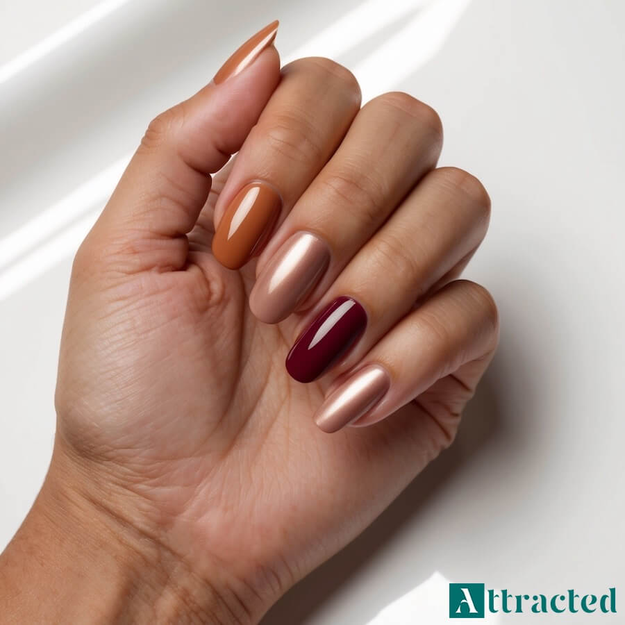 Aura nails to rozmyta poświata koloru na środku płytki – wygląda jak świetlisty halo. W ciepłych tonacjach (karmel, różane złoto, burgund) daje efekt zachodu słońca i pięknie „ociepla” skórę dłoni. Można iść w monochrom (baza nude + poświata w jednym kolorze) albo mix ciepłych kół na każdym paznokciu. Trik, który robi różnicę: bardzo delikatne rozproszenie krawędzi poświaty, żeby nie było twardych ringów.