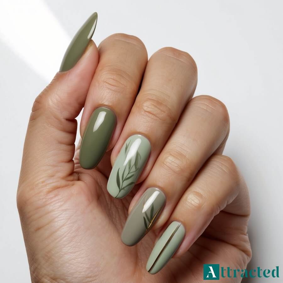 Oliwkowa zieleń i szałwia jako jesienny manicure ze złotymi akcentami
