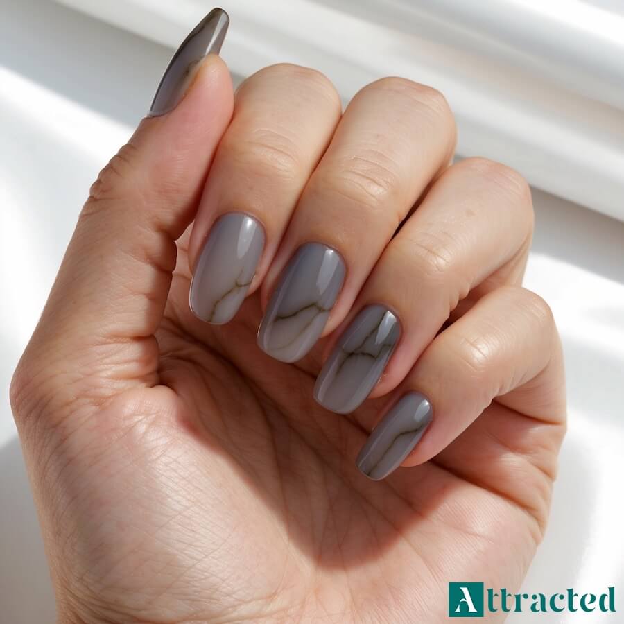 To manicure dla fanek stonowanej elegancji i „szklanego” efektu. Idealny na gale, prezentacje – wygląda dopracowanie, ale nie konkuruje ze strojem. Najlepiej sprawdza się na wszystkich długościach, choć średni owal eksponuje „dym” najbardziej naturalnie.