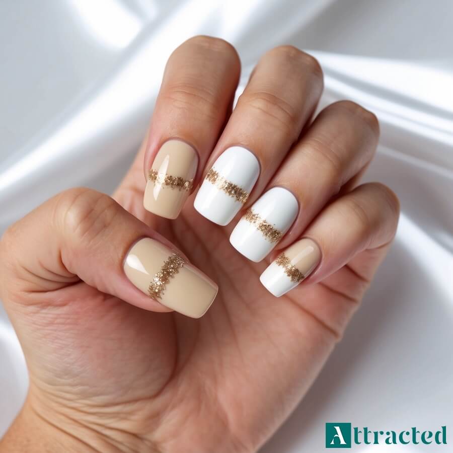 Proces rozpoczyna się od nałożenia bazy oraz koloru tła, który powinien być neutralny, np. beżowy lub kremowy. Następnie, przy użyciu białego i szarego lakieru, tworzy się marmurkowy wzór – można to zrobić techniką rozprowadzania lakieru za pomocą wykałaczki lub cienkiego pędzelka. Po utwardzeniu marmuru dodaje się złote akcenty: cienkie linie wzdłuż krawędzi paznokcia, nieregularne kropki lub delikatne żyłki przypominające naturalne złote inkluzje. Całość zabezpiecza się top coatem.