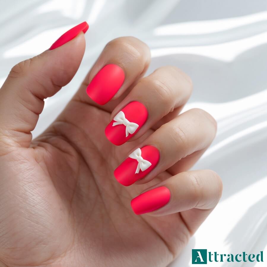 Styl „coquette” łączy słodką kobiecość z neonową śmiałością, tworząc manicure, który przypomina cukierkowy bunt. Neonowa czerwień staje się tłem dla kokardek, perełek i kryształków, balansując między niewinnością a ekstrawagancją.