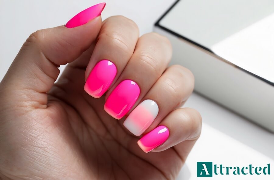 Negative space to sposób na ujarzmienie neonu. Zostawione „okienka” powietrza i półksiężyc przy nasadzie optycznie wydłużają łożysko i nadają paznokciom architektonicznej lekkości. Neonowy róż gra wtedy rolę akcentu, nie całej sceny. Drobne pionowe przerwy wysmuklają płytkę, a cieniutkie paski dodają grafiki. To prosta droga do nowoczesnego minimalizmu.